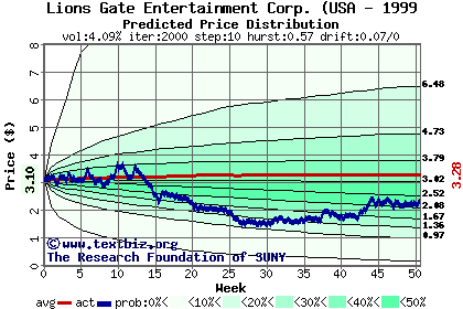 The high to date and low to date prices of the stock plotted against a random walk model for 1999 (what's this?).