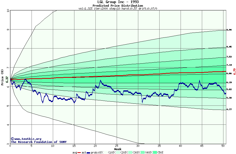 The following graph plots the year-to-date performance of the stock for 1993 compared to the probability calculated by a random walk model.