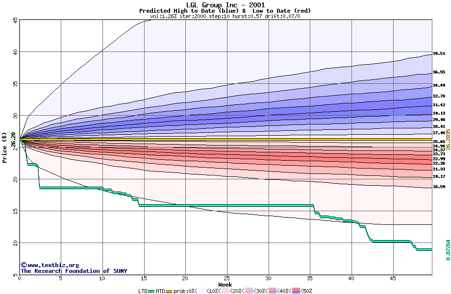 The high to date and low to date prices of the stock plotted against a random walk model for 2001 (what's this?).