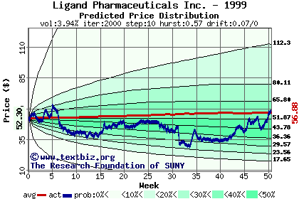 The following graph plots the year-to-date performance of the stock for 1999 compared to the probability calculated by a random walk model.