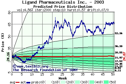 The following graph plots the year-to-date performance of the stock for 2003 compared to the probability calculated by a random walk model.