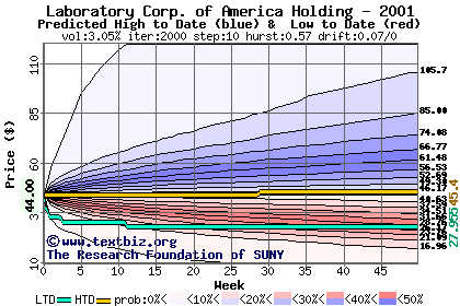 The high to date and low to date prices of the stock plotted against a random walk model for 2001 (what's this?).