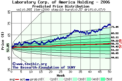 The high to date and low to date prices of the stock plotted against a random walk model for 2006 (what's this?).