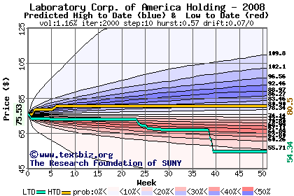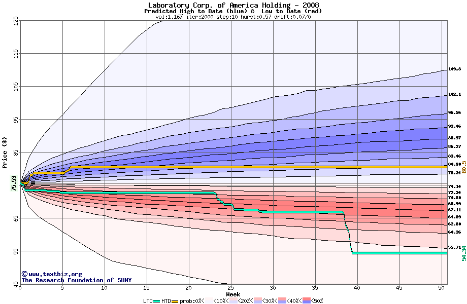 The high to date and low to date prices of the stock plotted against a random walk model for 2008 (what's this?).