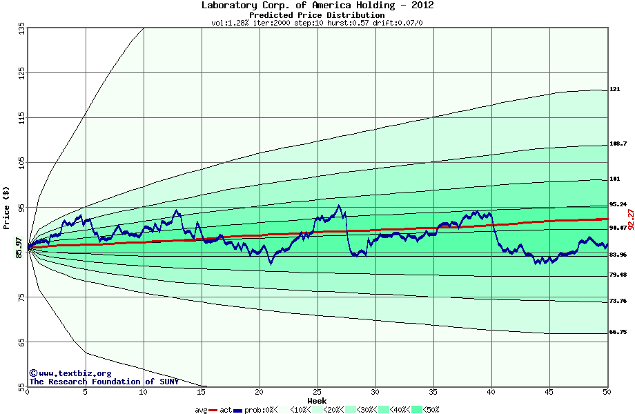 The following graph plots the year-to-date performance of the stock for 2012 compared to the probability calculated by a random walk model.
