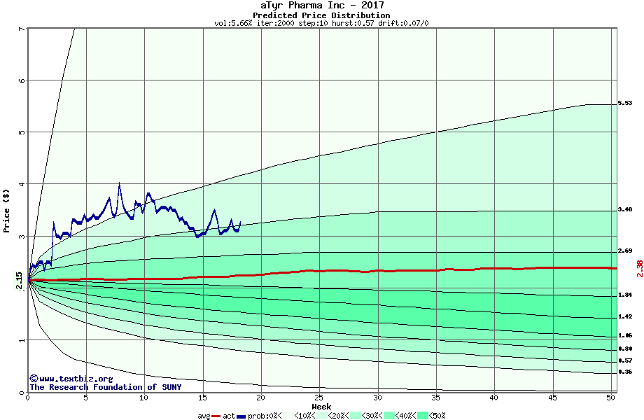 The high to date and low to date prices of the stock plotted against a random walk model for 2017 (what's this?).