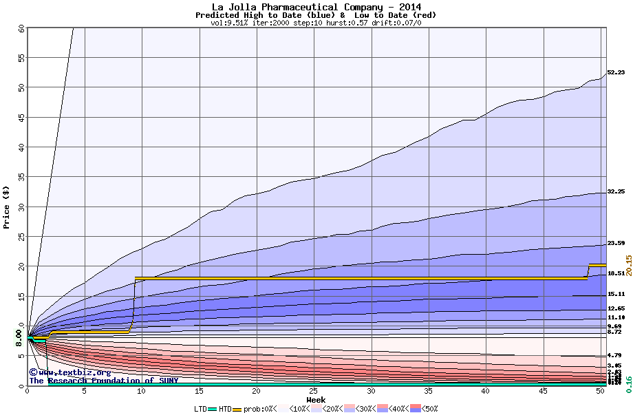 The high to date and low to date prices of the stock plotted against a random walk model for 2014 (what's this?).