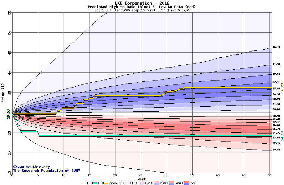 The high to date and low to date prices of the stock plotted against a random walk model for 2016 (what's this?).