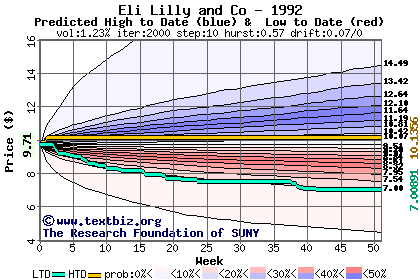 The high to date and low to date prices of the stock plotted against a random walk model for 1992 (what's this?).