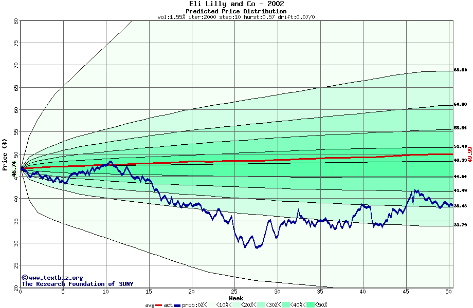 The following graph plots the year-to-date performance of the stock for 2002 compared to the probability calculated by a random walk model.