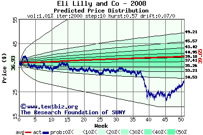 The following graph plots the year-to-date performance of the stock for 2008 compared to the probability calculated by a random walk model.