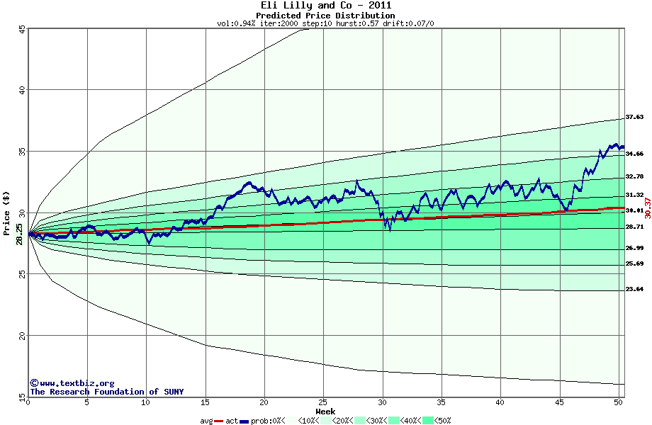 The following graph plots the year-to-date performance of the stock for 2011 compared to the probability calculated by a random walk model.