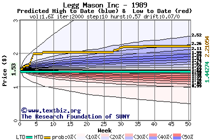 The high to date and low to date prices of the stock plotted against a random walk model for 1989 (what's this?).