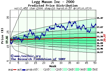 The high to date and low to date prices of the stock plotted against a random walk model for 2000 (what's this?).