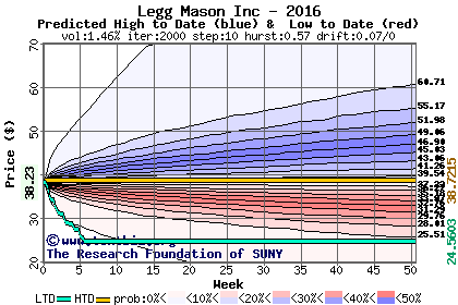 The high to date and low to date prices of the stock plotted against a random walk model for 2016 (what's this?).