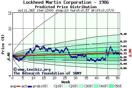 The high to date and low to date prices of the stock plotted against a random walk model for 1986 (what's this?).