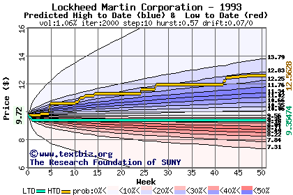 The high to date and low to date prices of the stock plotted against a random walk model for 1993 (what's this?).