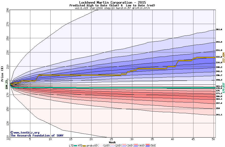 The following graph plots the year-to-date performance of the stock for 2015 compared to the probability calculated by a random walk model.