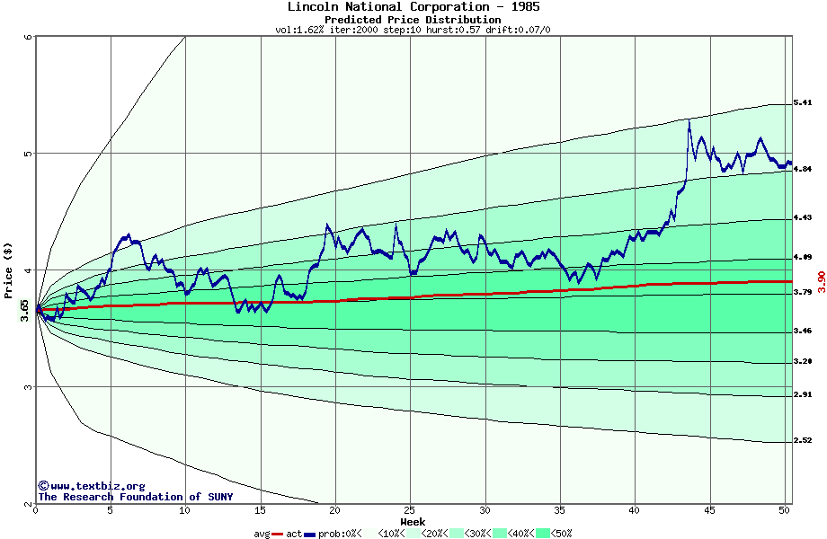 The following graph plots the year-to-date performance of the stock for 1985 compared to the probability calculated by a random walk model.