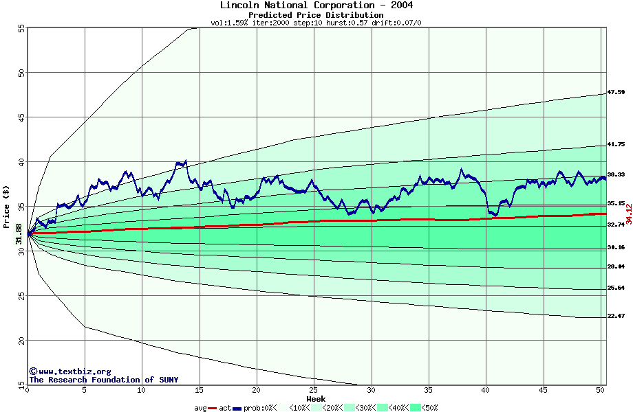 The following graph plots the year-to-date performance of the stock for 2004 compared to the probability calculated by a random walk model.