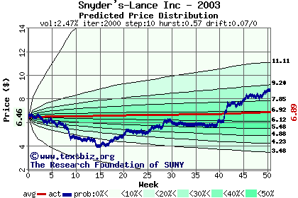 The high to date and low to date prices of the stock plotted against a random walk model for 2003 (what's this?).