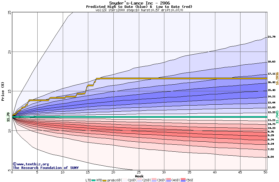 The high to date and low to date prices of the stock plotted against a random walk model for 2006 (what's this?).