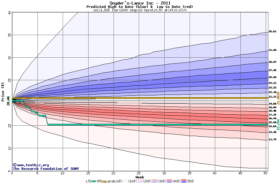 The high to date and low to date prices of the stock plotted against a random walk model for 2011 (what's this?).