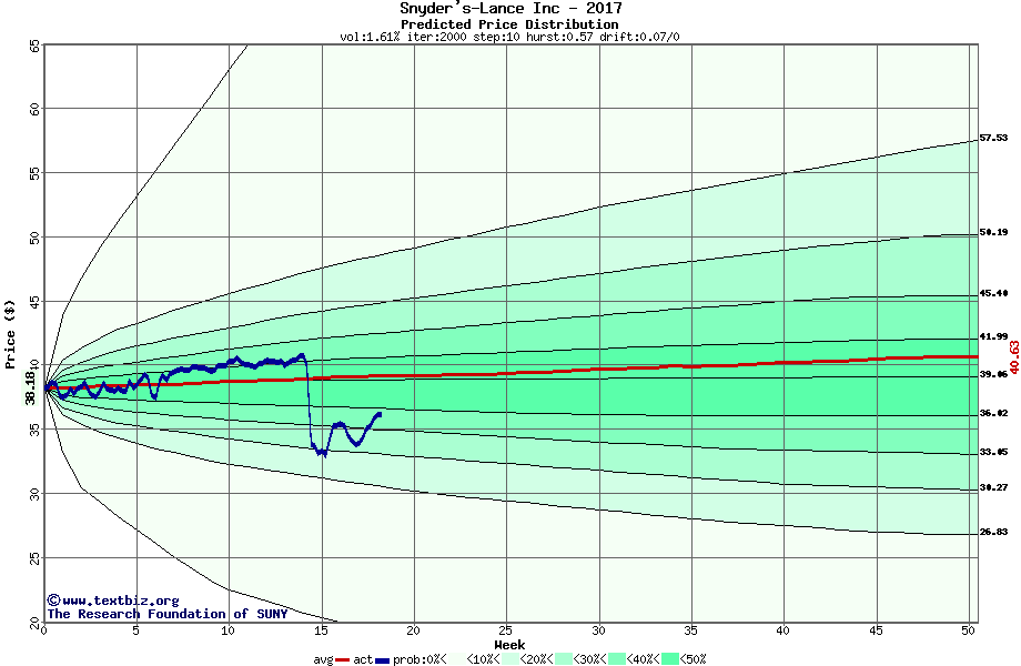 The following graph plots the year-to-date performance of the stock for 2017 compared to the probability calculated by a random walk model.