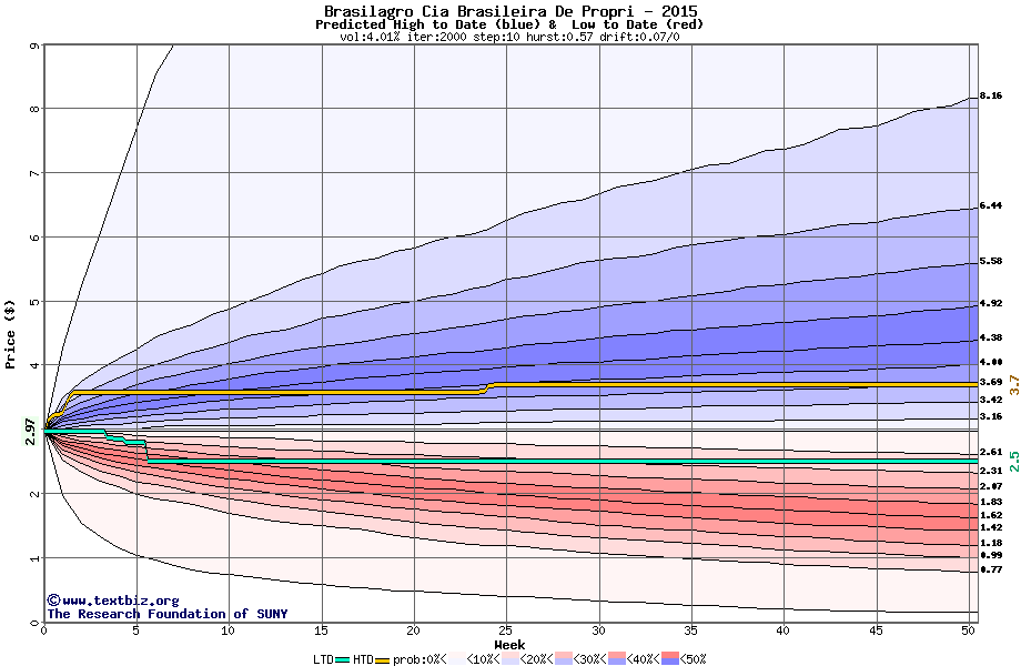 The high to date and low to date prices of the stock plotted against a random walk model for 2015 (what's this?).