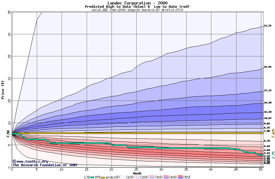 The high to date and low to date prices of the stock plotted against a random walk model for 2000 (what's this?).