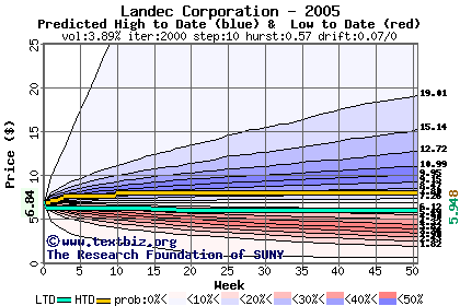 The high to date and low to date prices of the stock plotted against a random walk model for 2005 (what's this?).