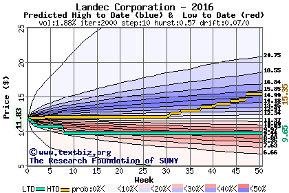 The high to date and low to date prices of the stock plotted against a random walk model for 2016 (what's this?).