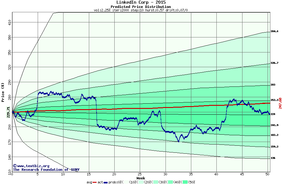 The following graph plots the year-to-date performance of the stock for 2015 compared to the probability calculated by a random walk model.