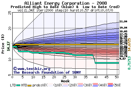 The high to date and low to date prices of the stock plotted against a random walk model for 2008 (what's this?).