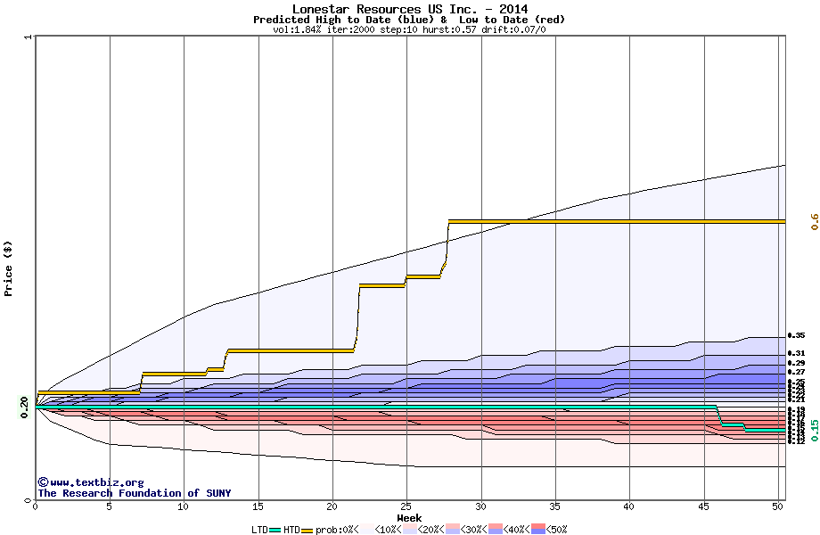 The high to date and low to date prices of the stock plotted against a random walk model for 2014 (what's this?).