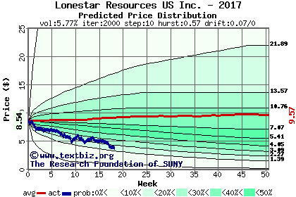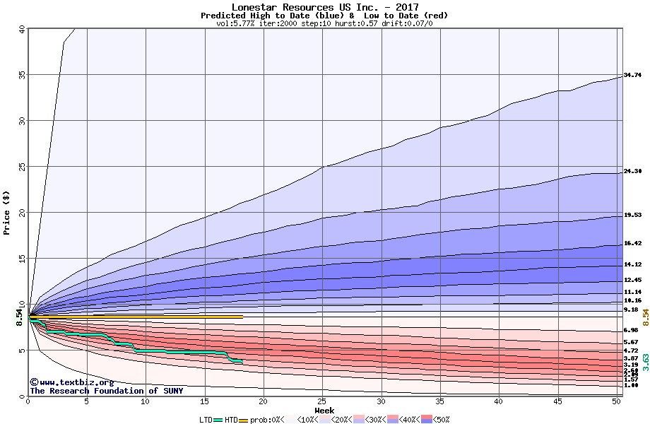 The high to date and low to date prices of the stock plotted against a random walk model for 2017 (what's this?).