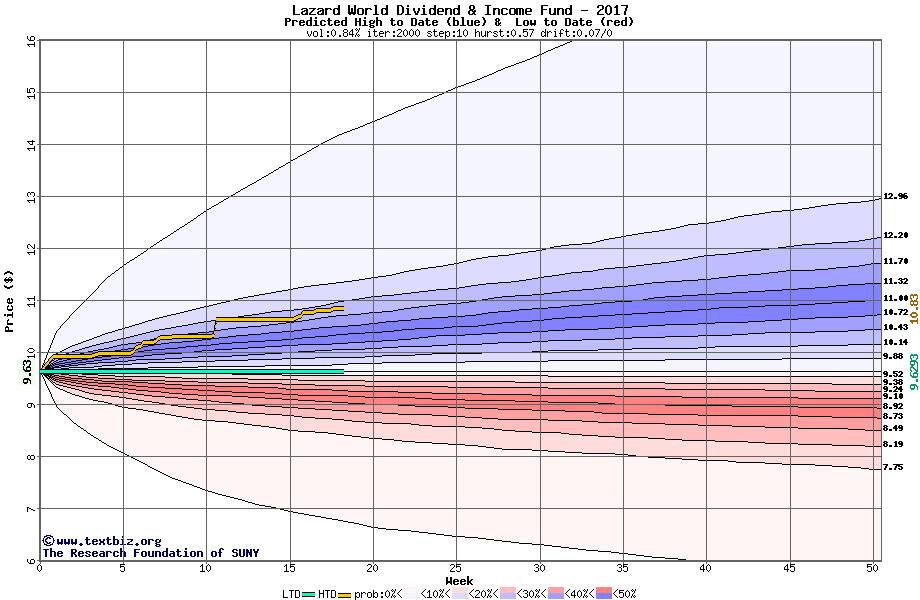 The high to date and low to date prices of the stock plotted against a random walk model for 2017 (what's this?).