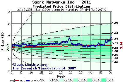 The high to date and low to date prices of the stock plotted against a random walk model for 2011 (what's this?).