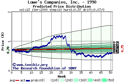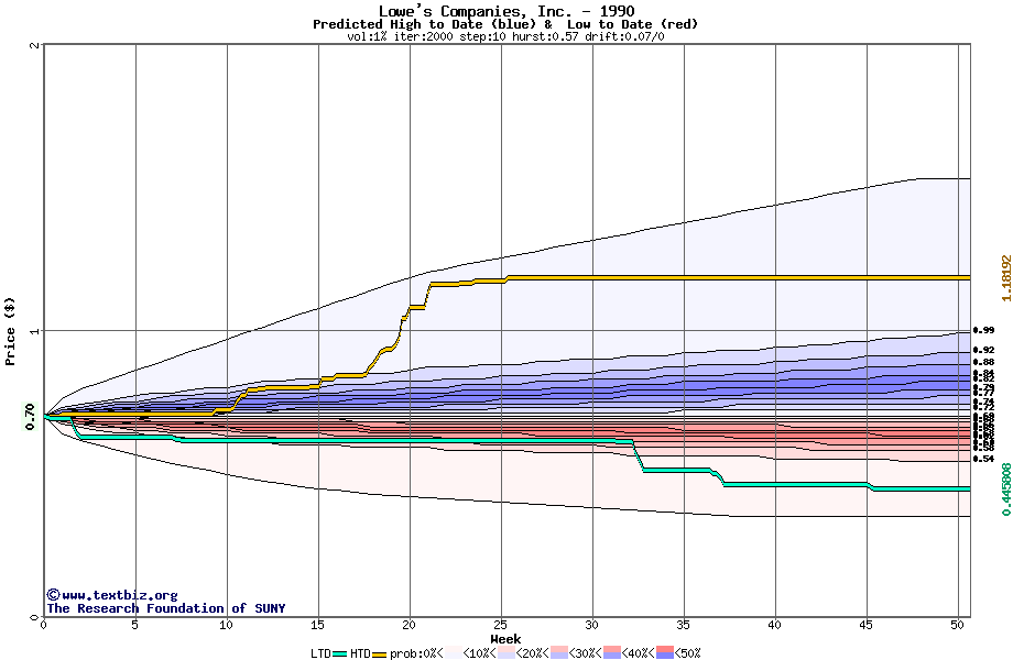 The high to date and low to date prices of the stock plotted against a random walk model for 1990 (what's this?).