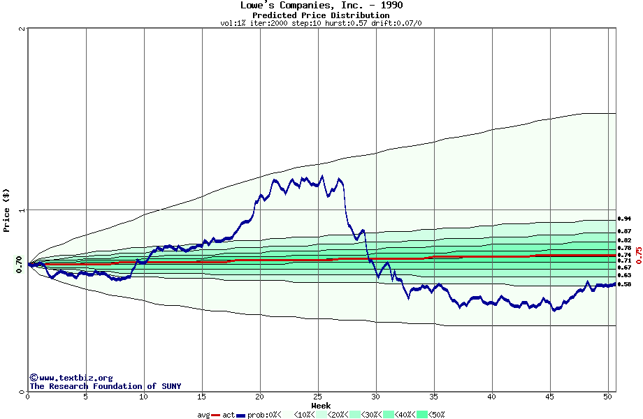 The following graph plots the year-to-date performance of the stock for 1990 compared to the probability calculated by a random walk model.
