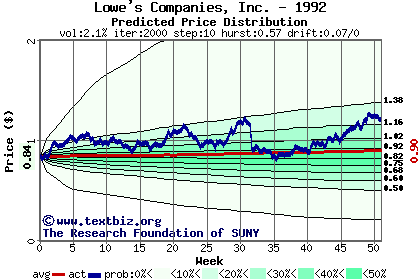 The high to date and low to date prices of the stock plotted against a random walk model for 1992 (what's this?).
