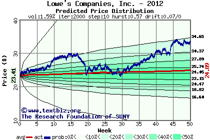 The high to date and low to date prices of the stock plotted against a random walk model for 2012 (what's this?).