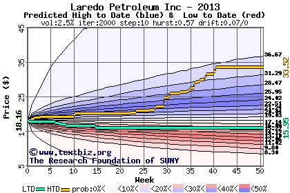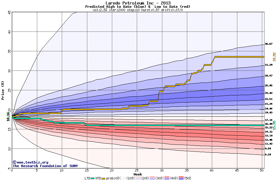 The high to date and low to date prices of the stock plotted against a random walk model for 2013 (what's this?).