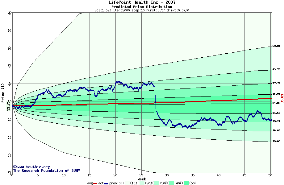 The following graph plots the year-to-date performance of the stock for 2007 compared to the probability calculated by a random walk model.