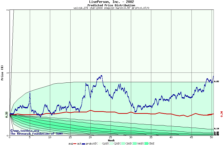 The following graph plots the year-to-date performance of the stock for 2002 compared to the probability calculated by a random walk model.