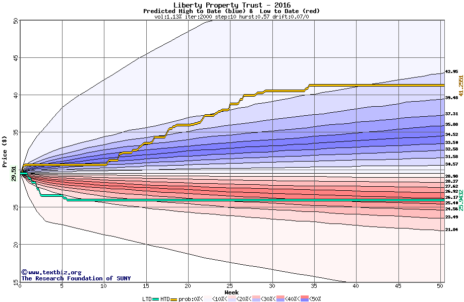 The high to date and low to date prices of the stock plotted against a random walk model for 2016 (what's this?).