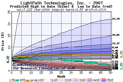 The high to date and low to date prices of the stock plotted against a random walk model for 2007 (what's this?).