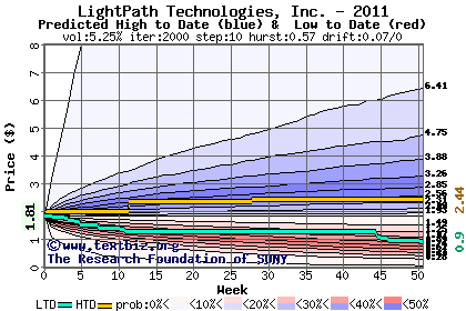 The high to date and low to date prices of the stock plotted against a random walk model for 2011 (what's this?).