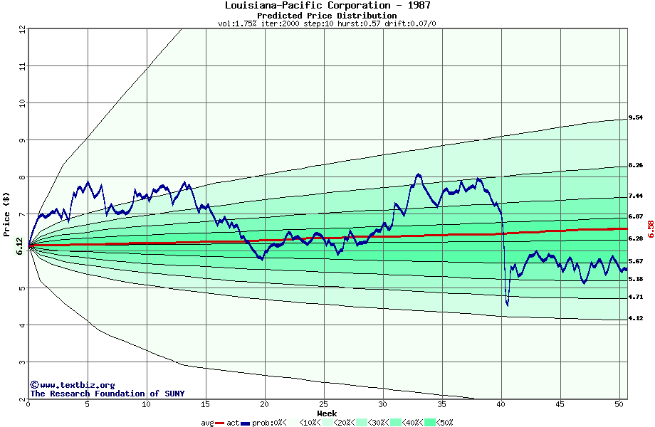 The following graph plots the year-to-date performance of the stock for 1987 compared to the probability calculated by a random walk model.