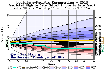 The high to date and low to date prices of the stock plotted against a random walk model for 2013 (what's this?).